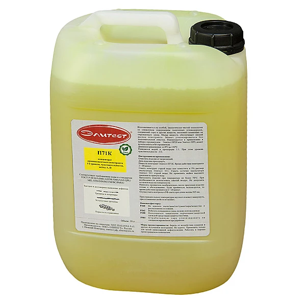 Концентрат люминесцентного пенетранта «Элитест П71К» на водной основе предназначен для нанесения на проверяемые детали для выявления поверхностных дефектов. Изготавливается по особой, экологически чистой технологии со сниженным содержанием галогенных углеводородов, соединений серы и других веществ, негативно влияющих на окружающую среду. Может утилизироваться без дополнительной очистки. Малая вязкость обеспечивает низкий расход пенетранта П71К. Разводится водой в пропорции 1:1. Пенетрант дает ясный люминесцентный желто-зеленый индикаторный рисунок, видимый в УФ-свете при длине волны 365 нм. Позволяет уверенно выявлять различные виды поверхностных дефектов: трещины сварных швов и основного металла, закаты, плены, расслоения, поры. «Элитест П71К» может использоваться в широком диапазоне температур (0°С ÷ 150°С) для контроля разных материалов в различных областях промышленности.