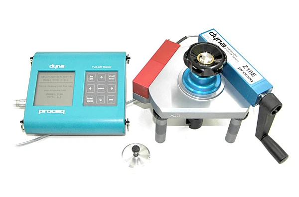 Области применения прибора для измерения адгезии покрытий методом отрыва DYNA: данный прибор предназначается для измерения прочности сцепления покрытия на конструкциях из бетона, а также пригоден для определения прочности бетона на растяжение. Датчик удобен в использовании, не требует установки измерительных приборов до начала бетонирования, может проводить измерения в любой точке конструкции. Датчик прочности DYNA идеален для определения повреждений различных конструкций и проверки качества восстановительных работ, способен измерить прочность сцепления таких покрытий, как пластик, цемент, штукатурка, битум, покрытий, нанесенных на металлы. Имеет несколько модификаций: Z (имеет встроенный цифровой манометр), ZE (оснащен датчиком давления и электронным блоком индикации DYNAMETER, который позволяет передавать данные на ПК), Dyna Estrich (определяет качество стяжки, измеряет прочность сцепления покрытий с полом).