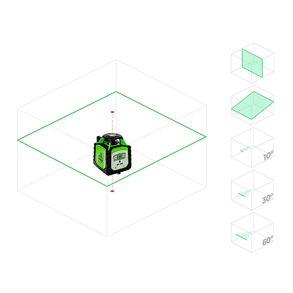 Ротационный нивелир RGK SP-100G можно перевести в ручной режим (без самовыравнивания) и выставить под любых необходимым углом. Наклонный луч пригодится для монтажа лестниц, элементов декора и ландшафтного дизайна.