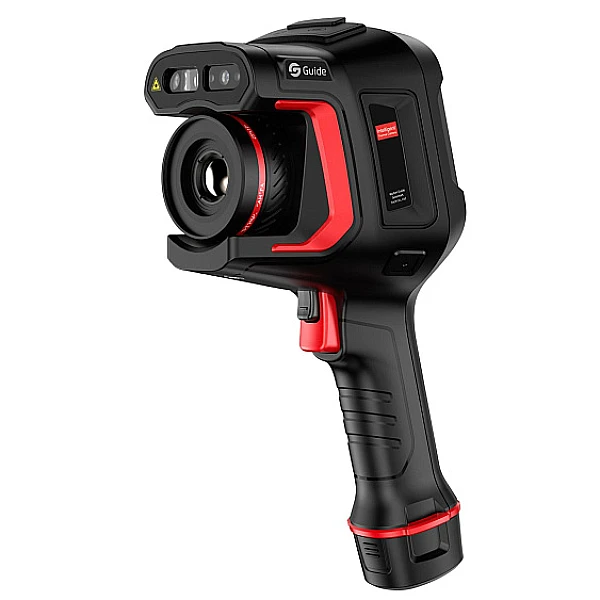Тепловизор Guide H3+ (Hammer Series) оснащён детектором с разрешением 384 x 288 пикселей и чувствительностью 45 мК, частота кадров 30Гц. Диапазон измерения температуры -40°C +150°C, 0°C +650°C с автоматическим переключением режимов работы, 5 режимов фокусировки. Опционально от 500°C до 2000°C. Тепловизор оснащён 8 мегапиксельной камерой, есть функция наложения изображений, фото с камеры видимого спектра на термограмму, в результате получается более чёткое ик-изображение за счёт прорисовки краёв объектов. В комплекте с камерой два аккумулятора, зарядки хватает на 5 часов работы. Используется в промышленности